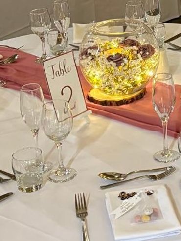 Table Centrepiece - All centrepieces come with a choice of colours to match your colour scheme, either a mirror plate or a wooden log base, tea lights, petals or scatter crystals.